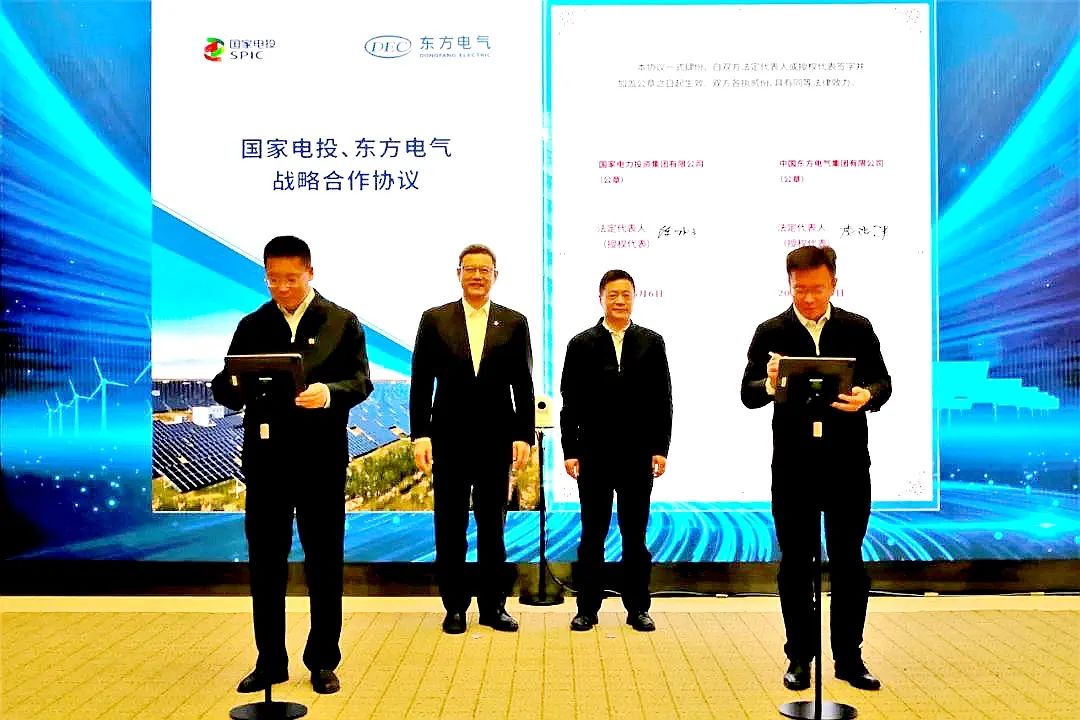 在東方電氣集團黨組書記、董事長俞培根,國家電投黨組書記、董事長錢智民的見證下,東方電氣集團黨組成員、副總經理李忠軍,國家電投黨組成員、副總經理徐樹彪分別代表雙方簽字。