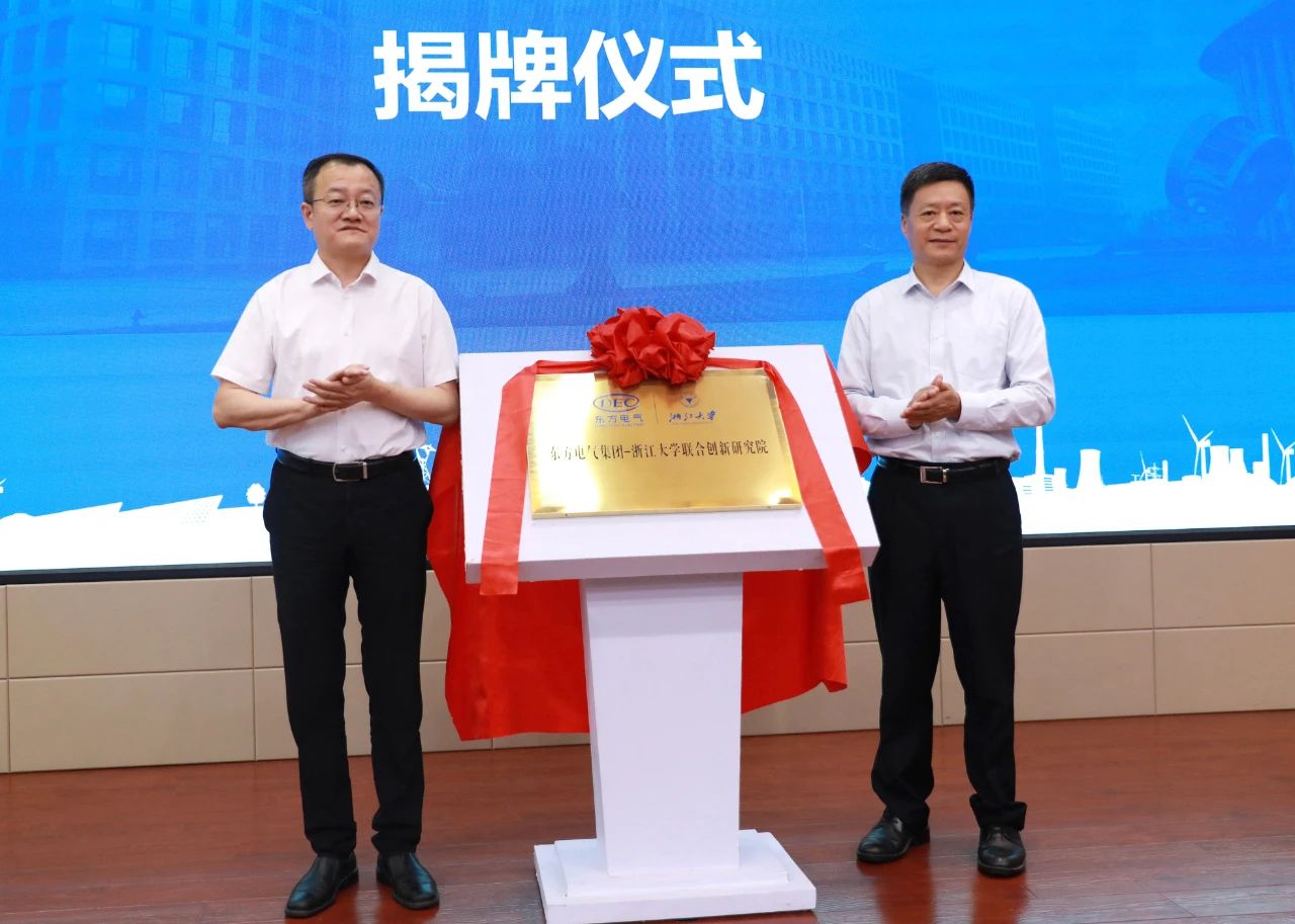 東方電氣集團黨組書記、董事長俞培根,浙江大學校長、黨委副書記杜江峰共同為聯(lián)合創(chuàng)新研究院揭牌。
