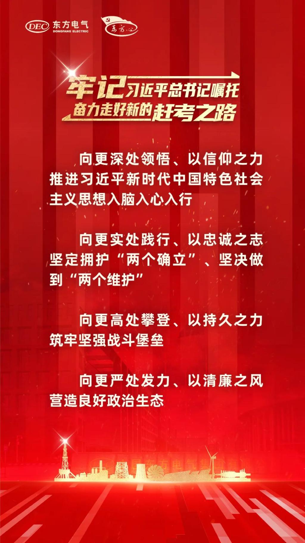 各級(jí)黨組織和全體黨員干部職工務(wù)必要以“東方心”黨建品牌為引領(lǐng),以黨建“三年攀高計(jì)劃”“登高而招”為牽引,向更深處領(lǐng)悟,向更實(shí)處踐行,向更高處攀登,向更嚴(yán)處發(fā)力,接續(xù)奮斗、勇毅前行,形成全集團(tuán)共擔(dān)使命、共譜新篇、攜手奮進(jìn)、萬馬奔騰的生動(dòng)局面,以東方電氣的“穩(wěn)”“進(jìn)”“立”為全國(guó)大局作出新的貢獻(xiàn)。