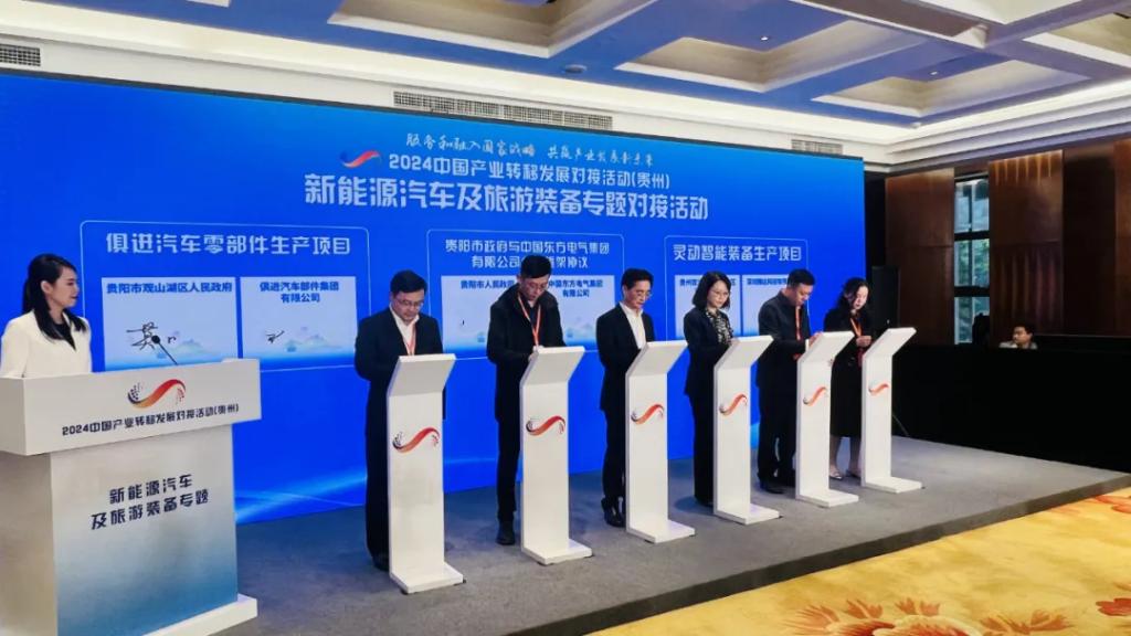 2024中國產業轉移發展對接活動(貴州)以“服務和融入國家戰略 共贏產業發展新未來”為主題,包括1場綜合活動和4場專題活動,圍繞資源精深加工及綜合利用、先進裝備制造、大數據電子信息、特色輕工等貴州特色優勢產業,開展地市推介、政企對接、實地考察、專家解讀、項目簽約等。在新能源汽車及旅游裝備專題對接活動中,東方電氣集團與貴陽市人民政府簽署了戰略合作框架協議。