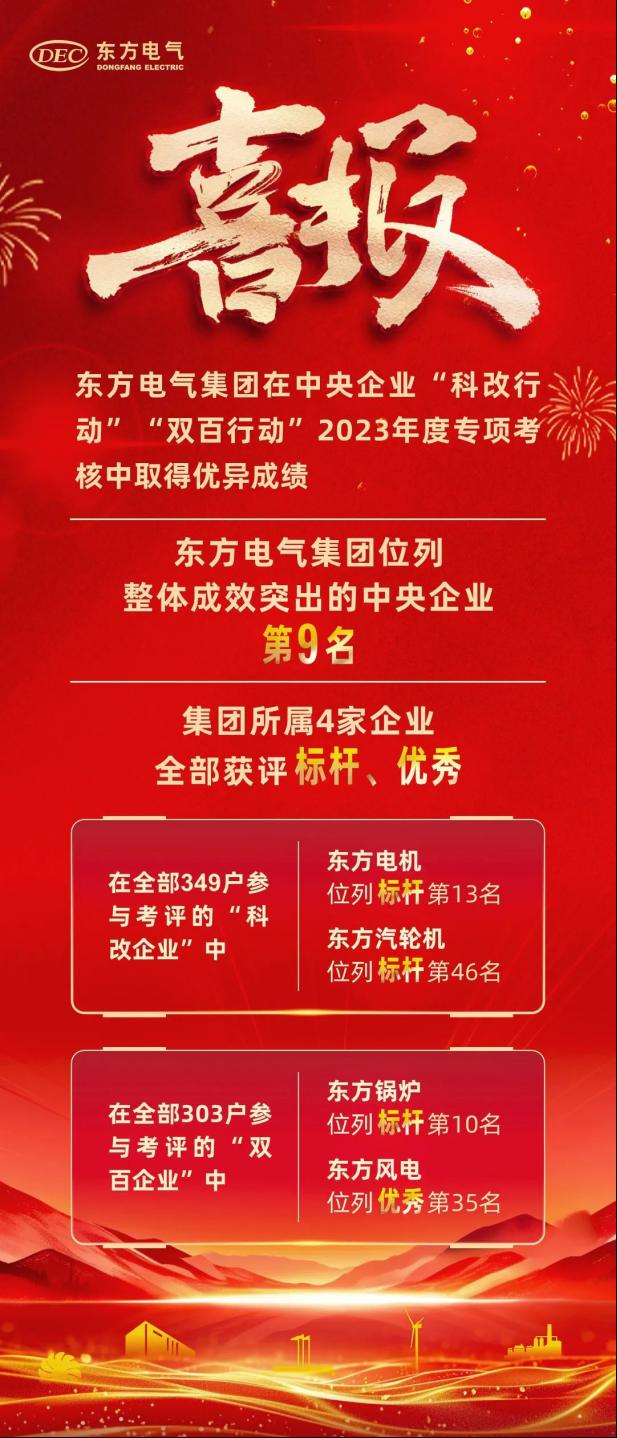 近本網(wǎng)訊 日,國務(wù)院國資委發(fā)布中央企業(yè)“科改行動”“雙百行動”2023年度專項考核結(jié)果,東方電氣集團(tuán)在推進(jìn)“科改行動”“雙百行動”整體成效突出的34家中央企業(yè)中位列第9名。東方電氣集團(tuán)所屬4家企業(yè)均取得優(yōu)異成績,其中東方電機(jī)、東方汽輪機(jī)分別位列“科改行動”標(biāo)桿企業(yè)第13名、標(biāo)桿企業(yè)第46名,東方鍋爐、東方風(fēng)電分別位列“雙百行動”標(biāo)桿企業(yè)第10名、優(yōu)秀企業(yè)第35名。