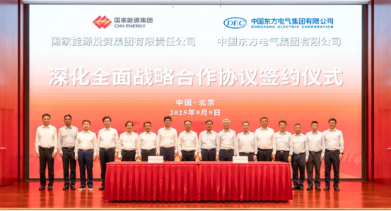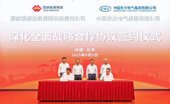 9月9日,中國東方電氣集團(tuán)有限公司與國家能源投資集團(tuán)有限責(zé)任公司在京簽署深化全面戰(zhàn)略合作協(xié)議。東方電氣集團(tuán)黨組書記、董事長羅乾宜,總經(jīng)理、黨組副書記張彥軍,國家能源集團(tuán)黨組書記、董事長鄒磊,總經(jīng)理、黨組副書記馮來法共同見證協(xié)議簽署。東方電氣集團(tuán)黨組成員、副總經(jīng)理王軍,國家能源集團(tuán)黨組成員、副總經(jīng)理傅振邦代表雙方簽署協(xié)議。